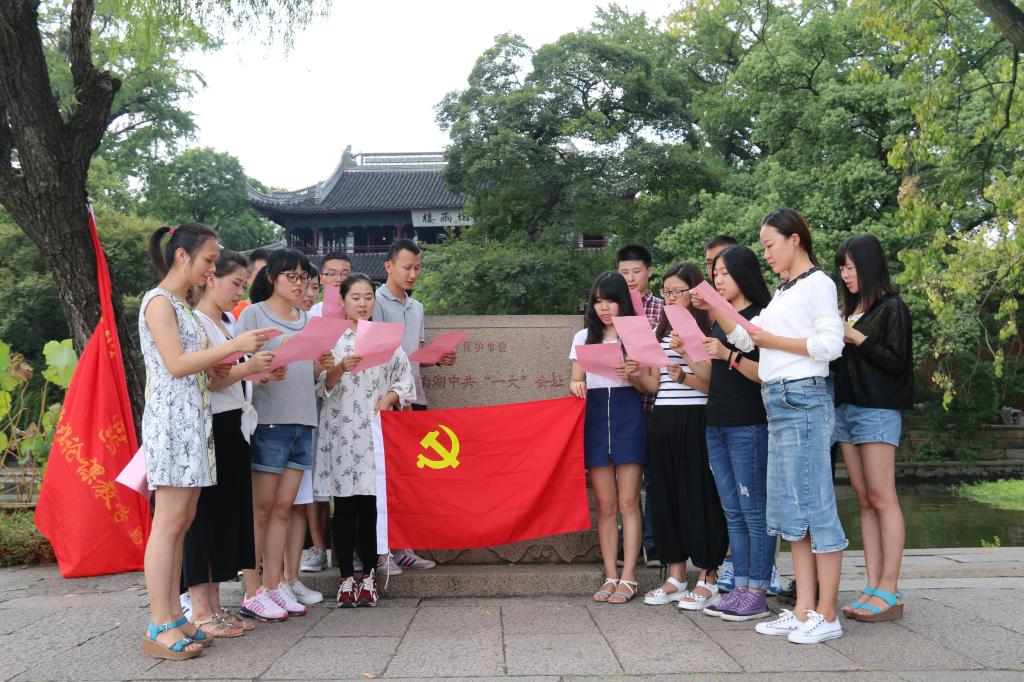 下午大家乘船前往红船所在地烟雨楼。小艇横穿波光粼粼的湖面,在阳光的辉映中稀疏的杨柳也多了几分姿色。烟雨楼下,红船之畔,在鲜红的党旗见证下,思政部2015级17名研究生庄严宣誓:“谨记浙财校训,肩负时代使命,热爱专业,尊重导师,诚信治学,守正创新……”静静的南湖似乎还在讲述远去的革命历史,湖畔的红船仿佛一位饱经风霜的革命志士,亲眼见证了决定中国革命命运的历史性时刻。