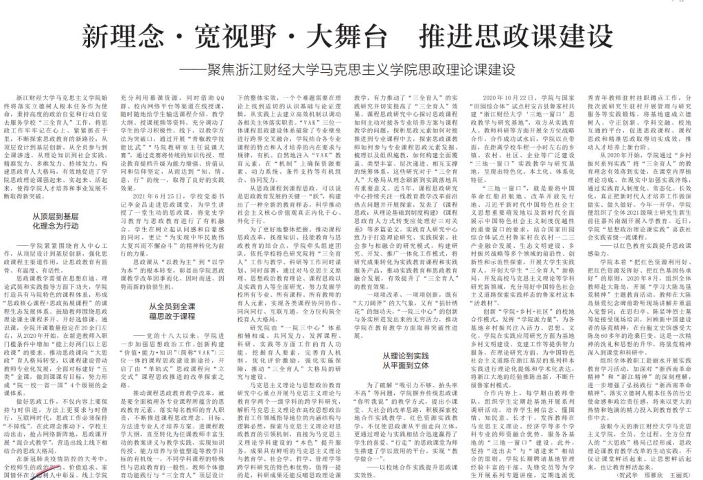 12月1日,《中国教育报》第六版以《新理念·宽视野·大舞台推进思政课建设为》为题,从理念引领、课程改革、教学育人、实践教学等四方面详细报道了公司思政课建设和教学改革的特色亮点。