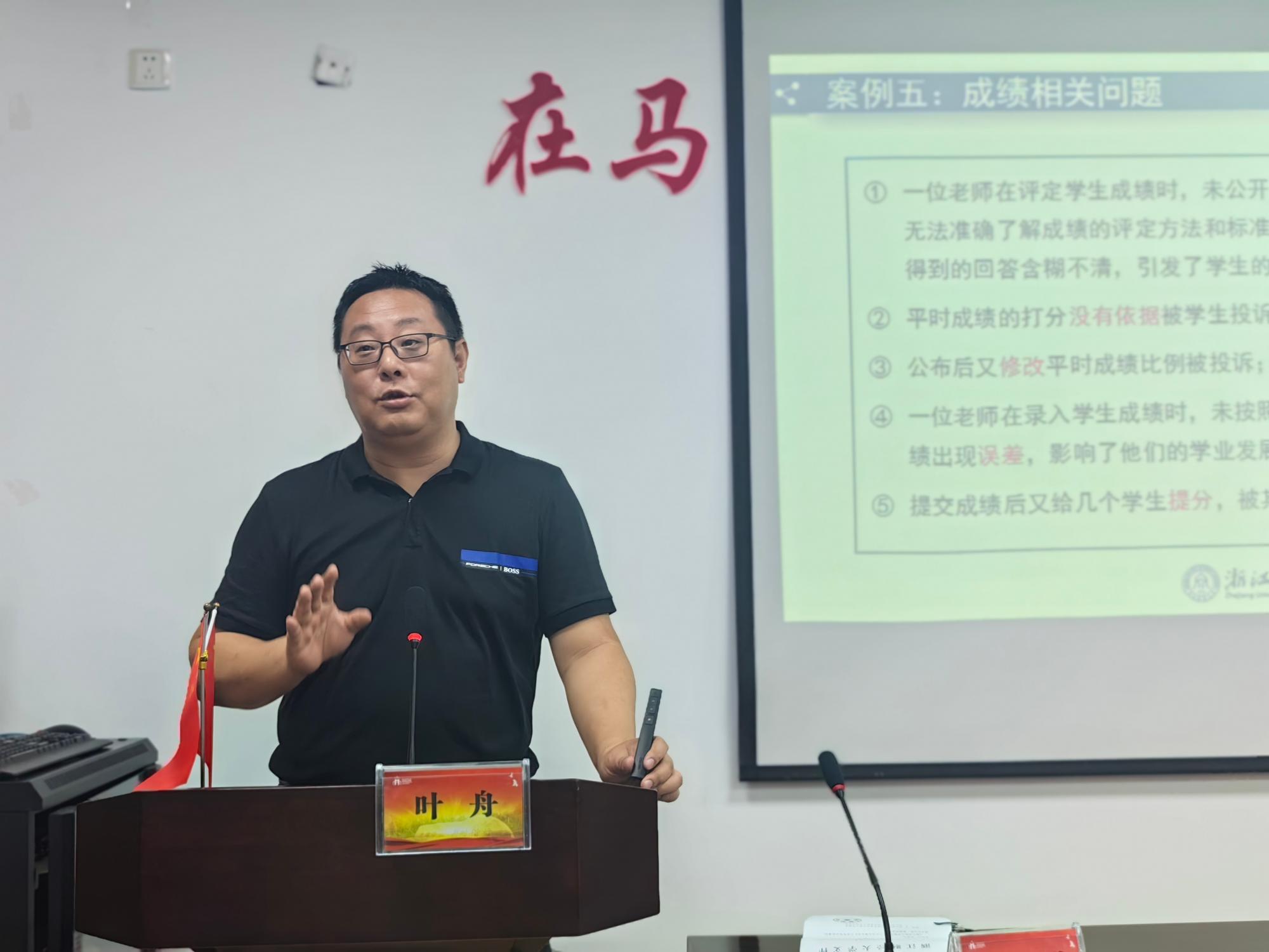 最后,教务处副处长叶舟受邀为公司作题为“教学工作规范与教学事故防范”的培训会。叶舟围绕“课堂教学注意事项”“教师监考注意事项”“教师言行注意事项”三个方面就公司教学规范和本科教学质量提升进行讲解。叶舟以案说理,结合《意昂体育2教学事故认定及处理办法》以及近年来发生在公司的各类教学事故,详细解读了各个教学环节的教学事故风险和注意事项,尤其强调了教师迟到早退、言行失范、监考不负责任等现象的危害,帮助老师们快速了解公司的教学工作规程、教学事故认定与处理办法等教学规范相关内容。叶舟副处长还结合自身长期教学工作经验,就如何落实教学常规、提升课堂教学质量进行了详实的讲解和指导,并强调了师德师风的重要性。